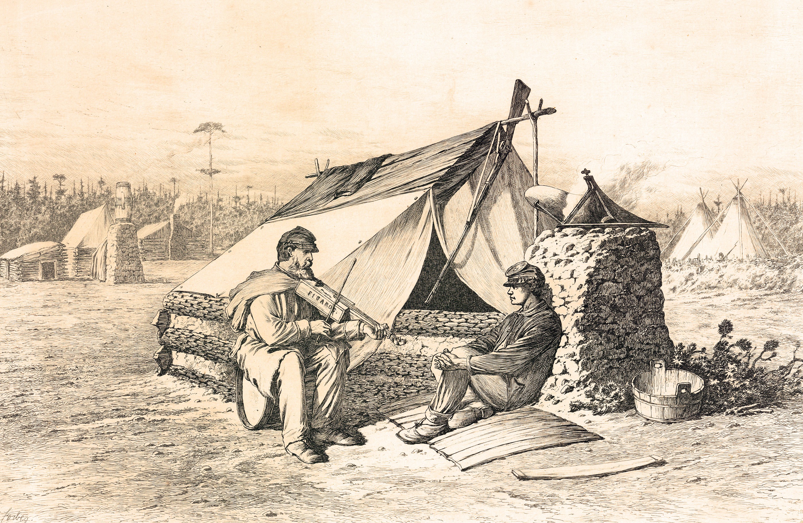 The earliest cigar-box instruments we can point to show up in the mid-19th century. There’s an 1876 etching of two Civil War soldiers at a winter campfire—one of them clearly playing a fiddle built from a Figaro cigar box with a long neck grafted on.