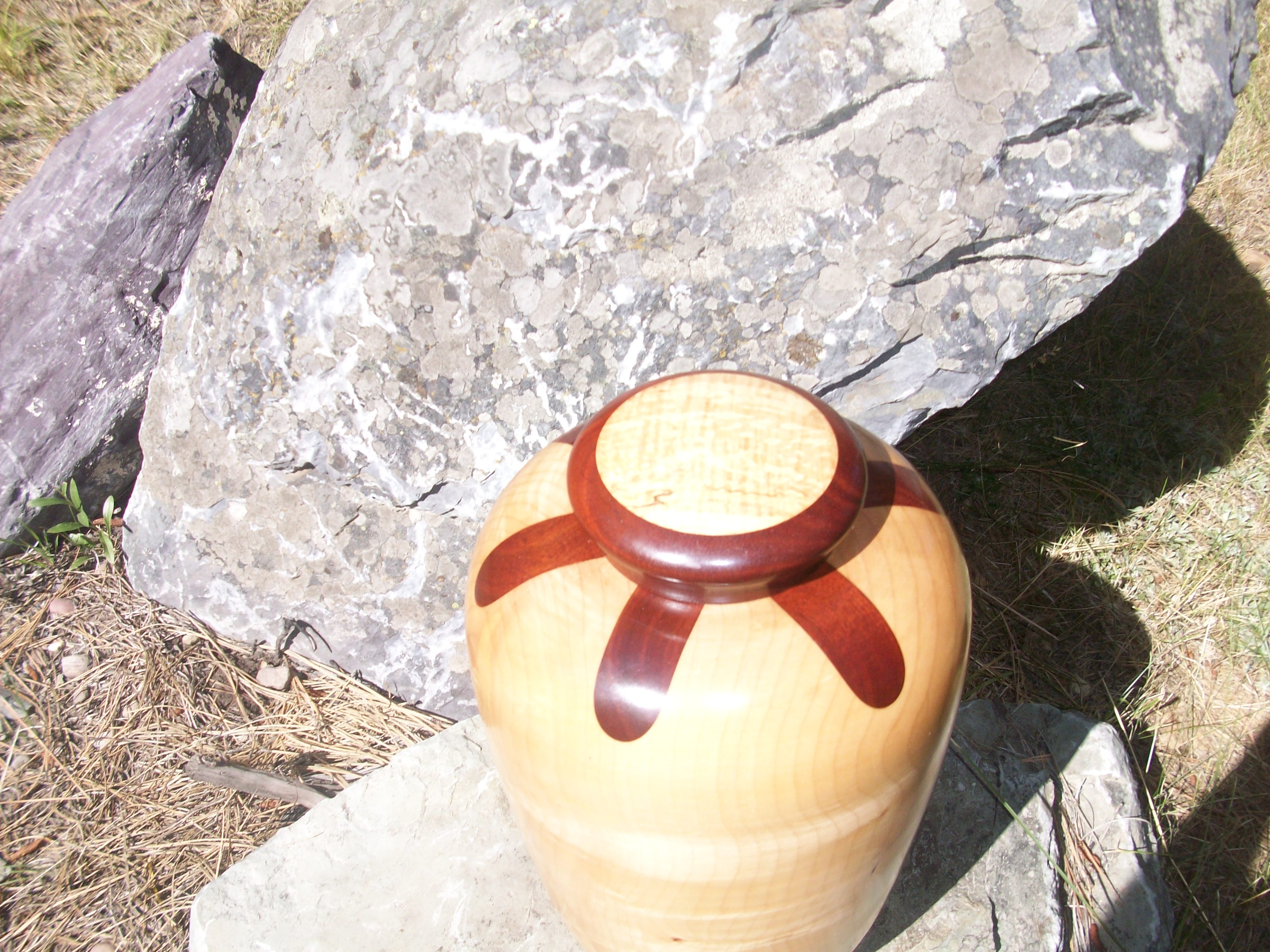 The lid features precision-cut Bloodwood inlays that cascade down over the rim, adding both visual interest and craftsmanship that can only be achieved by hand. Each curve is smooth and deliberate, showcasing the natural grain of the maple and the refined balance of form and function.