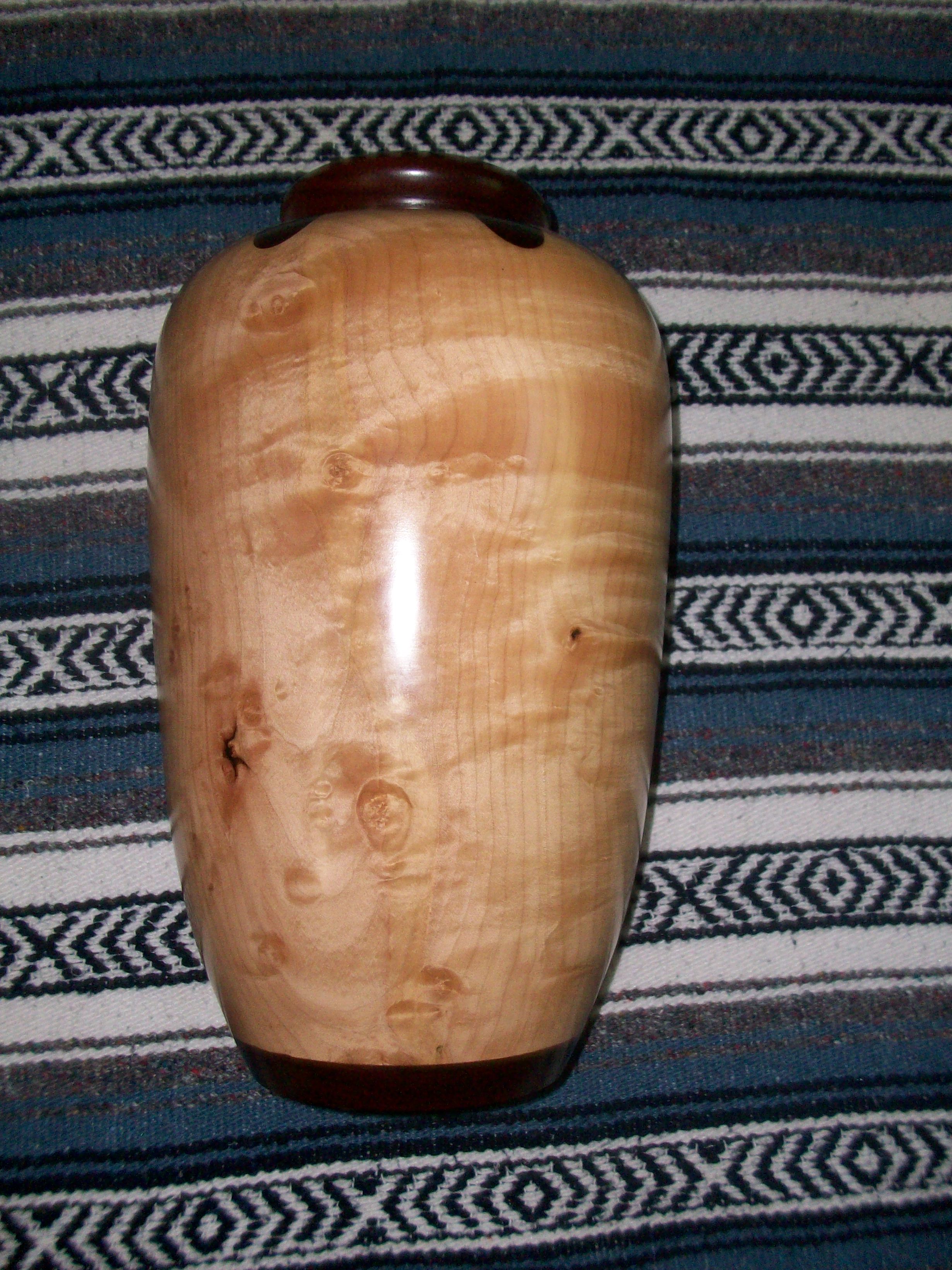This elegant lidded vessel is hand-turned from beautifully figured maple and accented with Bloodwood details. The contrast between the light, creamy maple body and the deep, warm Blood Wood top creates a striking, timeless design.