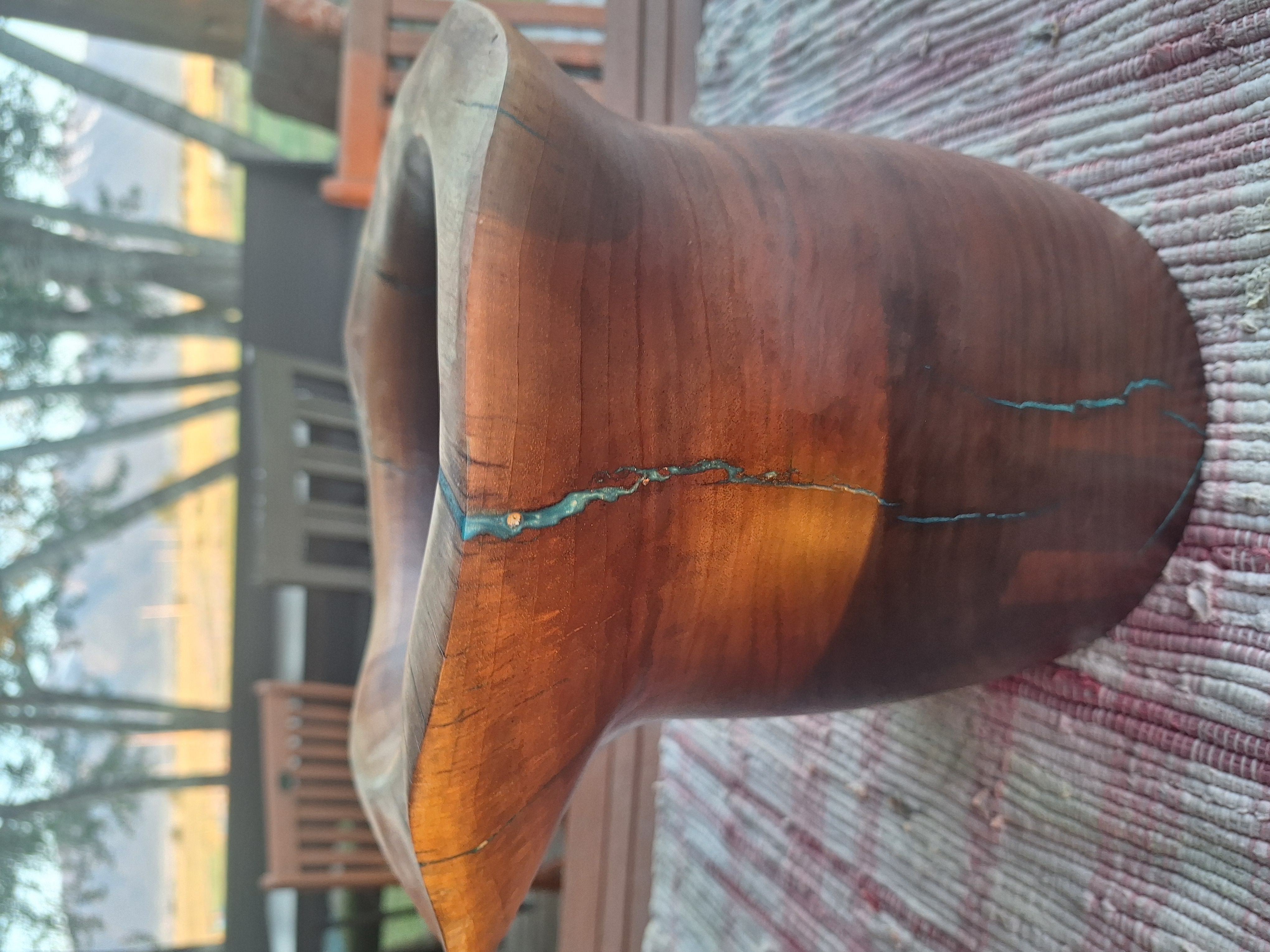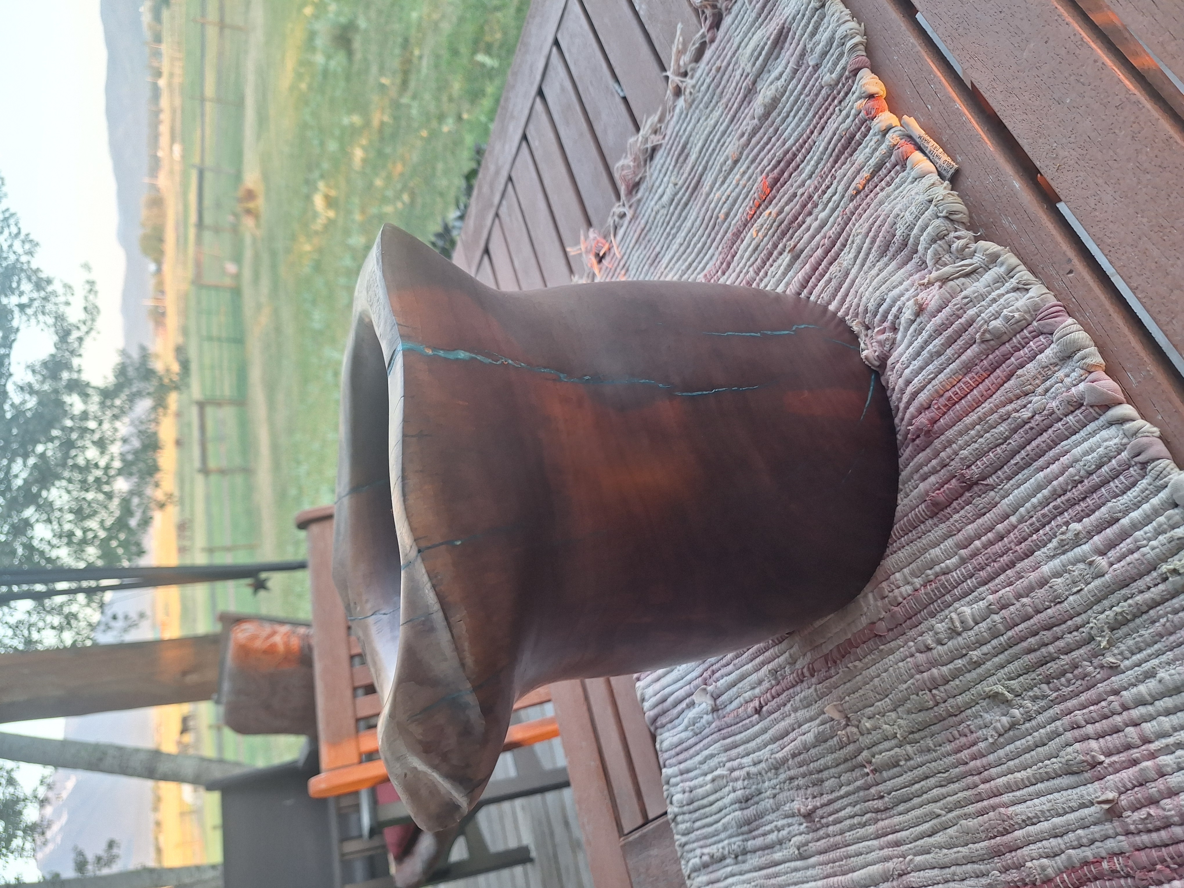 This one-of-a-kind vessel is hand-turned from rich Montana walnut and finished with striking blue epoxy resin accents that highlight the wood’s natural character.